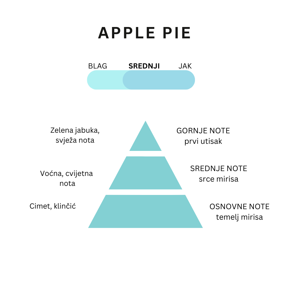 Note tople začinjene pite od jabuka kroz svježe, voćne i cvijetne note ispunjavaju osjećajem topline i sreće. Srednji nivo jačine mirisa.