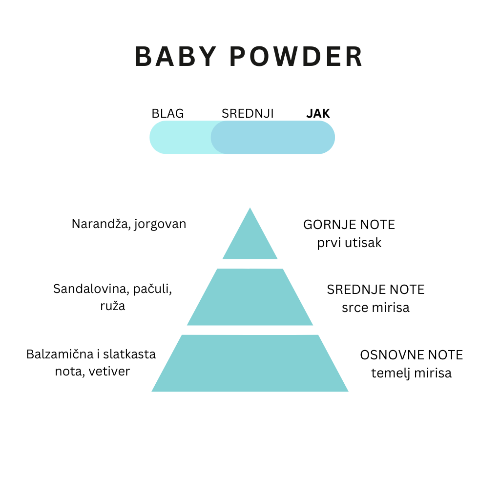 Osjećaj mekoće i nježnosti bebe otelovljen mirisom u flaši, dobijen kombinacijom jorgovana, narandže, ruže, pačulija, balzamika i vetivera. Jak nivo jačine mirisa.