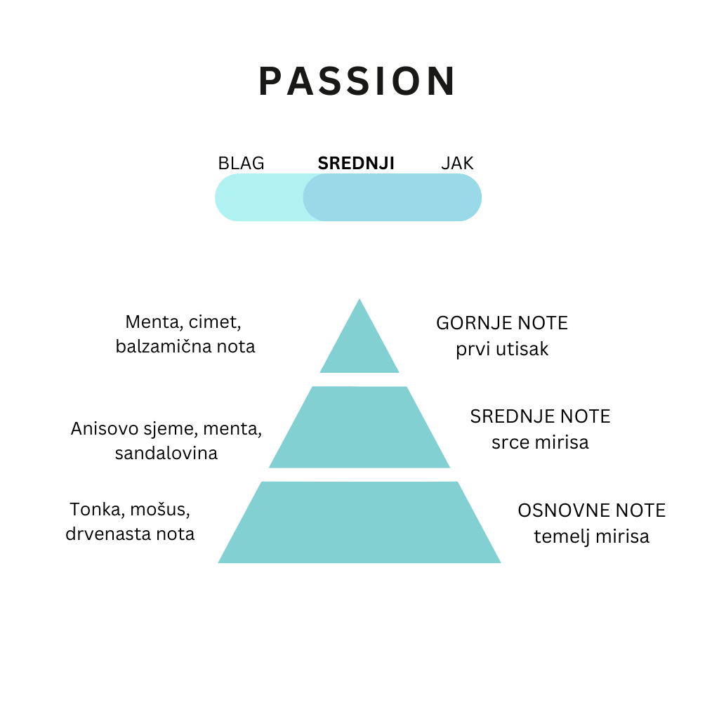 Osjetite strastvenu avanturu skrivenu u zrnu tonke, sjemenu anisa i mošusu koji u pozadini ima mentu, cimet, passion fruit i balzamične note. Srednji nivo jačine mirisa.