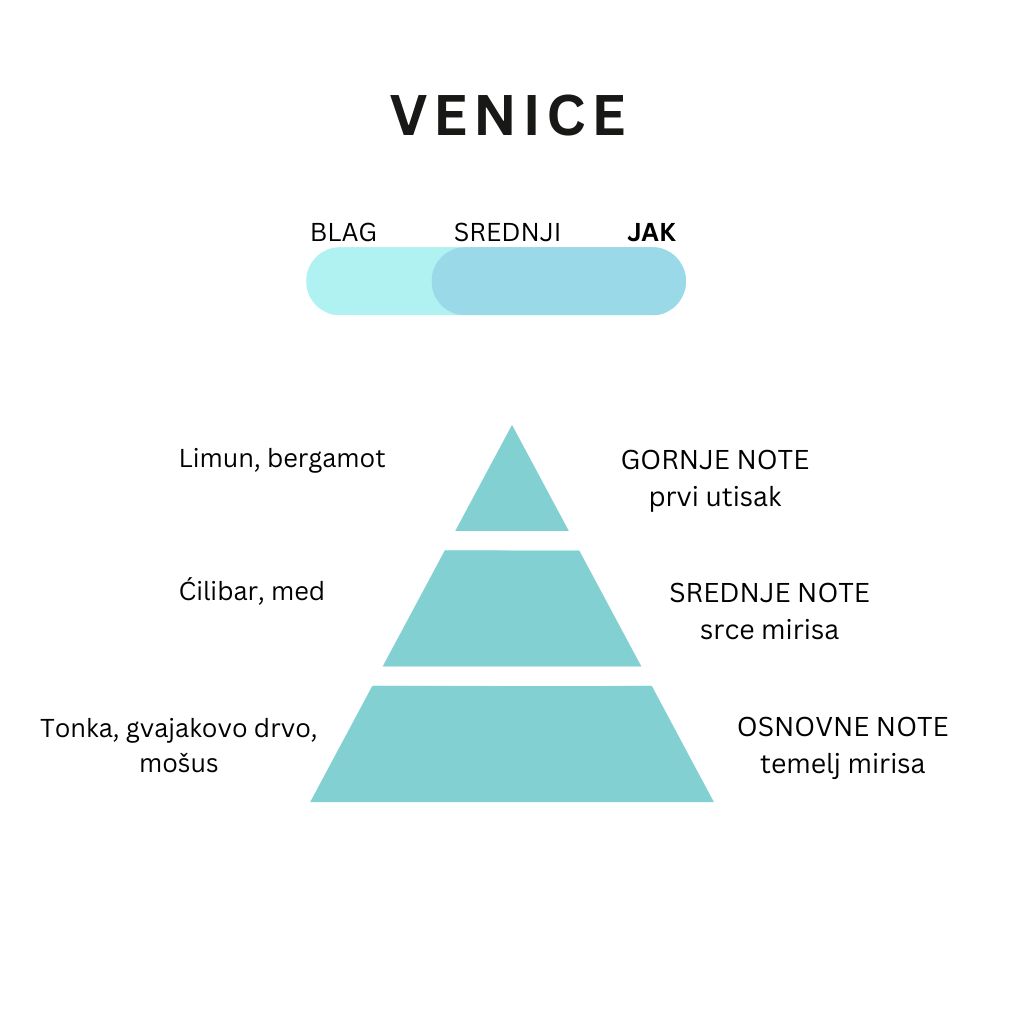 Inspirisan lijepim italijanskim gradom, ‘Venice’ se je od svježine i živosti morskog povjetarca sa primamljivim spojom začinskih nota i aromatičnog drveta Jak intenzitet jačine mirisa.
